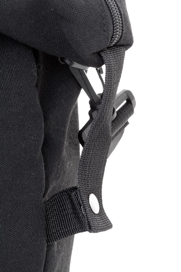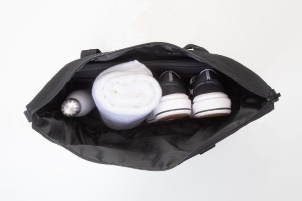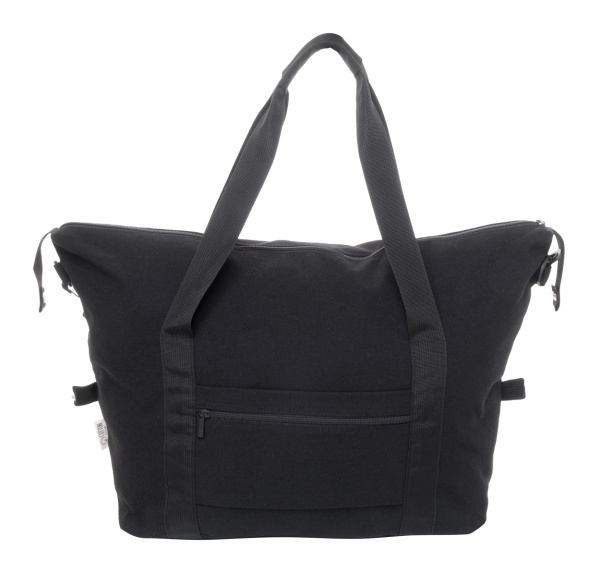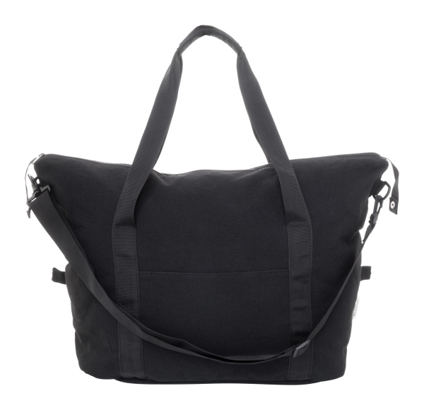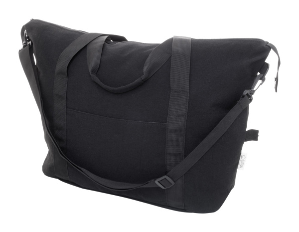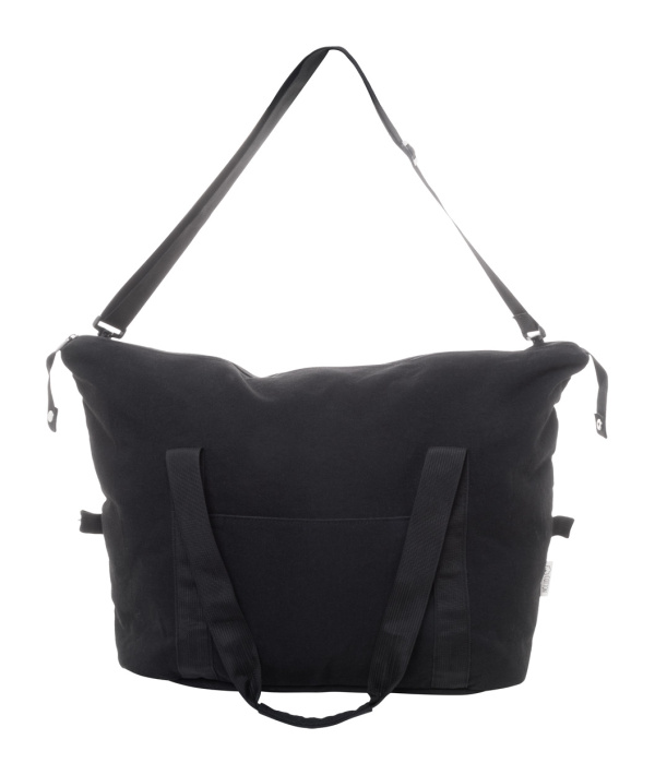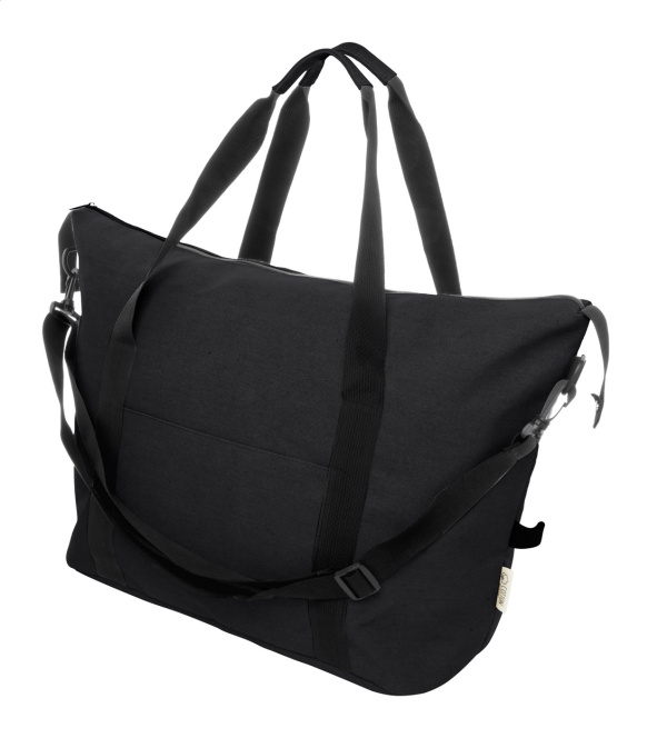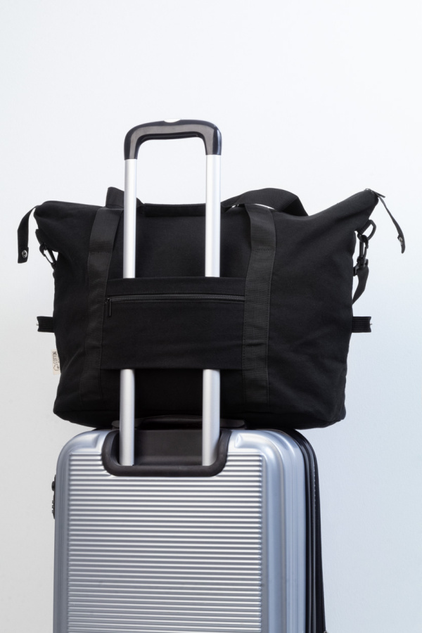 Cestovná / športová taška z recyklovaného plátna s hlavným oddielom na zips, predným vreckom, nastaviteľným ramenným popruhom a zadným vreckom na zips, ktoré slúžia ako popruh na vozík. 70% recyklovanej bavlny a 30% RPET polyesteru. S výrazným štítkom z recyklovanej bavlny.