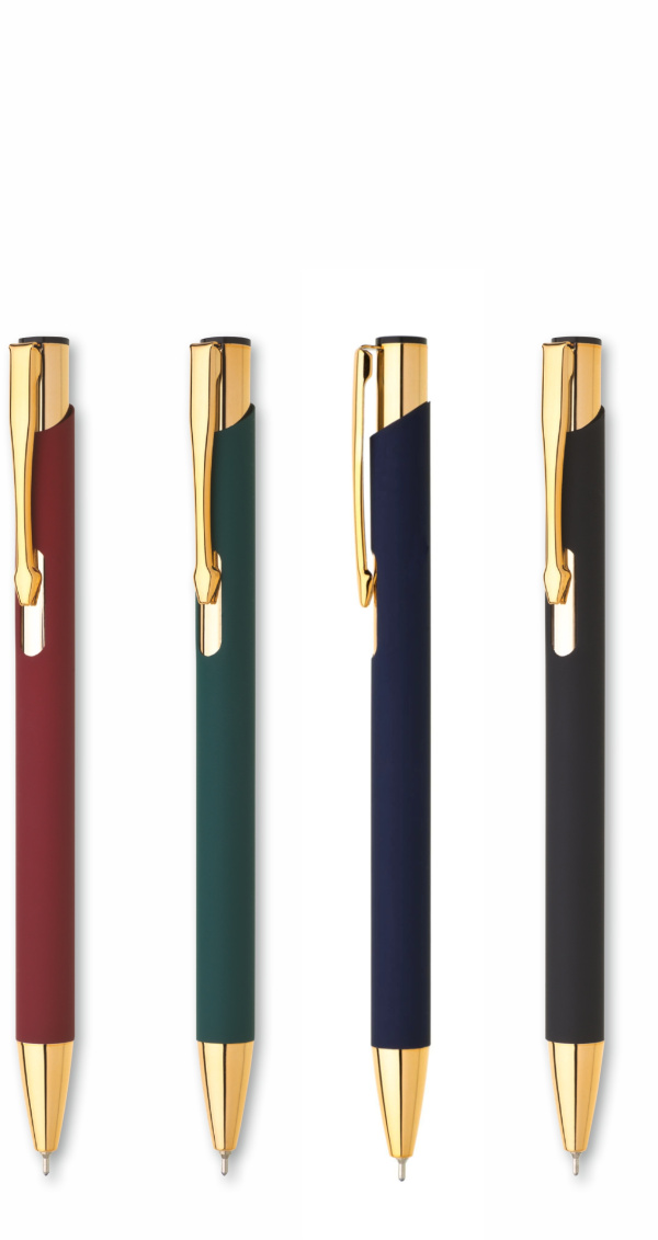 Kovové guľôčkové pero VALMI SOFT s pogumovanou úpravou a zlatými doplnkami. Vďaka špeciálnemu povrchu logo po gravírovaní bude taktiež v zlatej farbe. Náplň modrá, semigel s mikrohrotom.