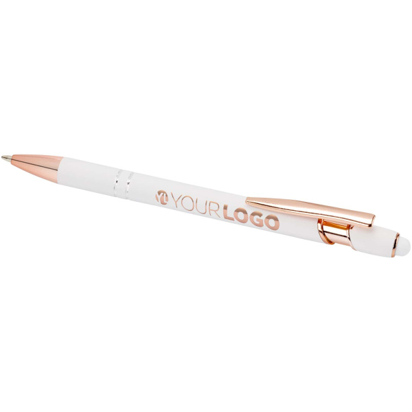 Guľôčkové pero Nanna s povrchovou úpravou z ružového zlata má telo vyrobené z recyklovaného hliníka a dotykový stylus vyrobený zo silikónu. Znižuje tiež množstvo odpadu na skládkach a pomáha šetriť prírodné zdroje s cieľom znížiť emisie skleníkových plynov. Farba atramentu: Modrá. Dĺžka písania: 800 metrov. Rozmer hrotu: 1,0 mm.