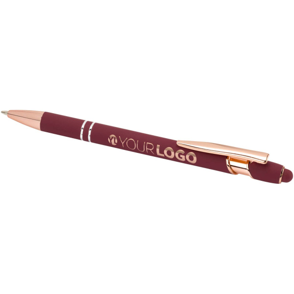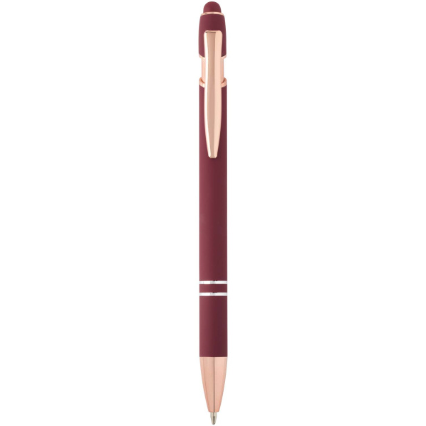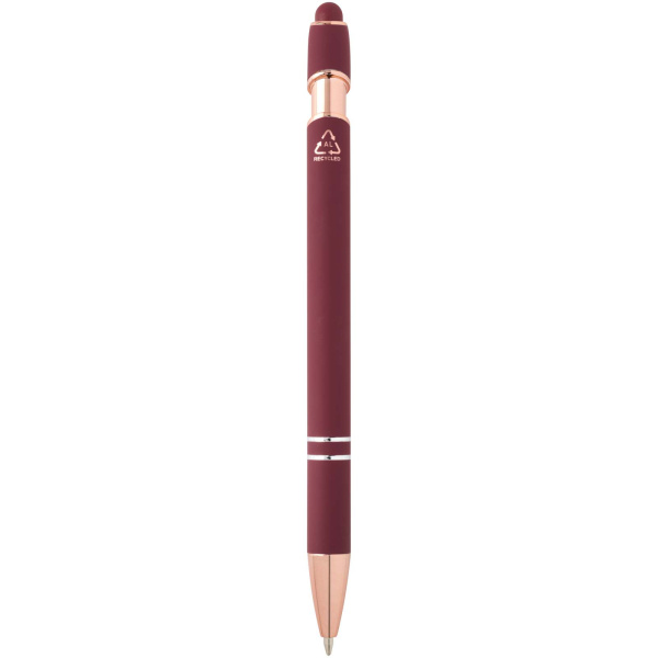 Guľôčkové pero Nanna s povrchovou úpravou z ružového zlata má telo vyrobené z recyklovaného hliníka a dotykový stylus vyrobený zo silikónu. Znižuje tiež množstvo odpadu na skládkach a pomáha šetriť prírodné zdroje s cieľom znížiť emisie skleníkových plynov. Farba atramentu: Modrá. Dĺžka písania: 800 metrov. Rozmer hrotu: 1,0 mm.