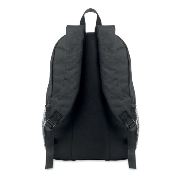 Batoh z polyesteru RPET s ozdobnou šnúrkou a predným vreckom na zips. Sieťované vrecká na oboch stranách.