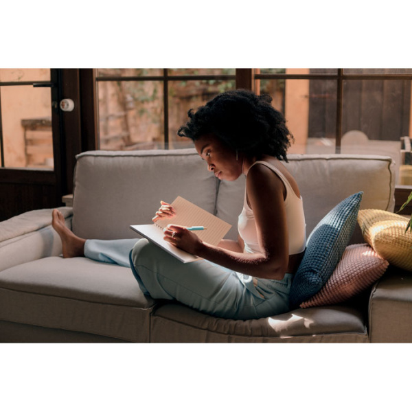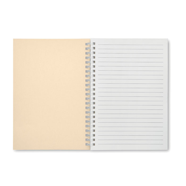 Zápisník A5 s krúžkovou väzbou a mäkkou obálkou z recyklovaného kartónu. 160 recyklovaných linkovaných strán (80 listov).