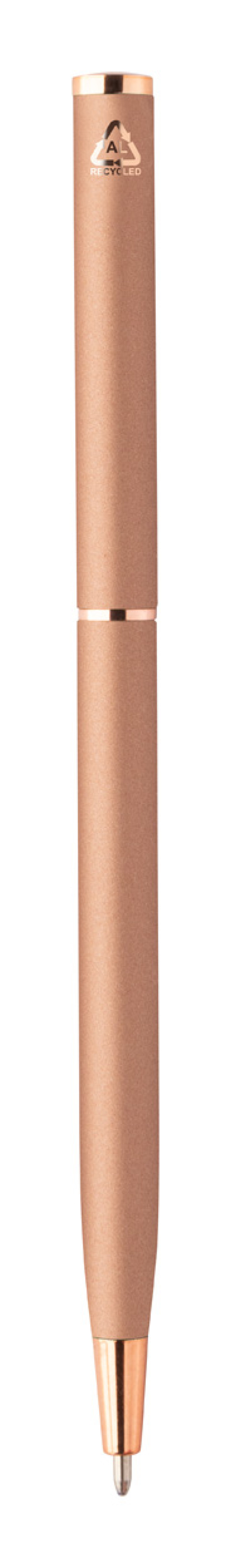 Guľôčkové pero z recyklovaného hliníka s pogumovaným povrchom a detaily z ružového zlata. So špeciálnou povrchovou úpravou na zrkadlové laserové gravírovanie vo farbe ružového zlata. S modrou náplňou.