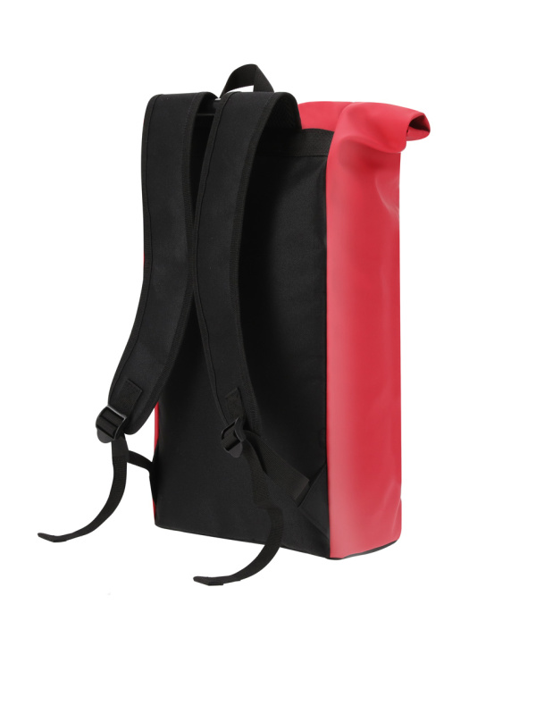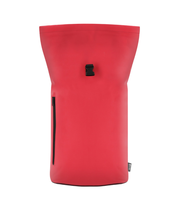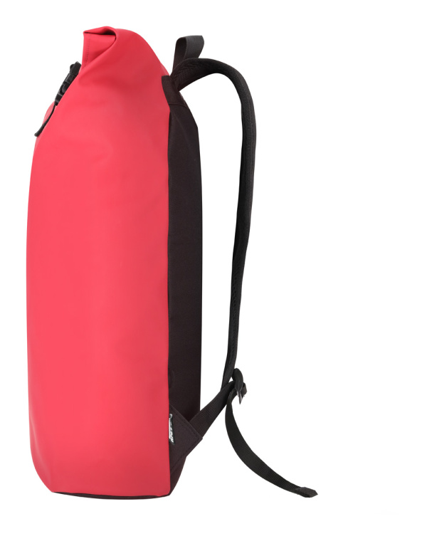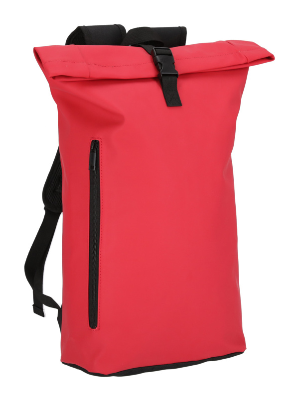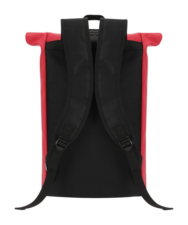 Vodotesný, mäkký rolovací batoh z recyklovanej PU kože so zapínaním na pracku, predným vreckom na zips a polstrovanou priehradkou na notebook (15"). S polstrovaným chrbtom a ramennými popruhmi. S výrazným recyklovaným PU štítkom.