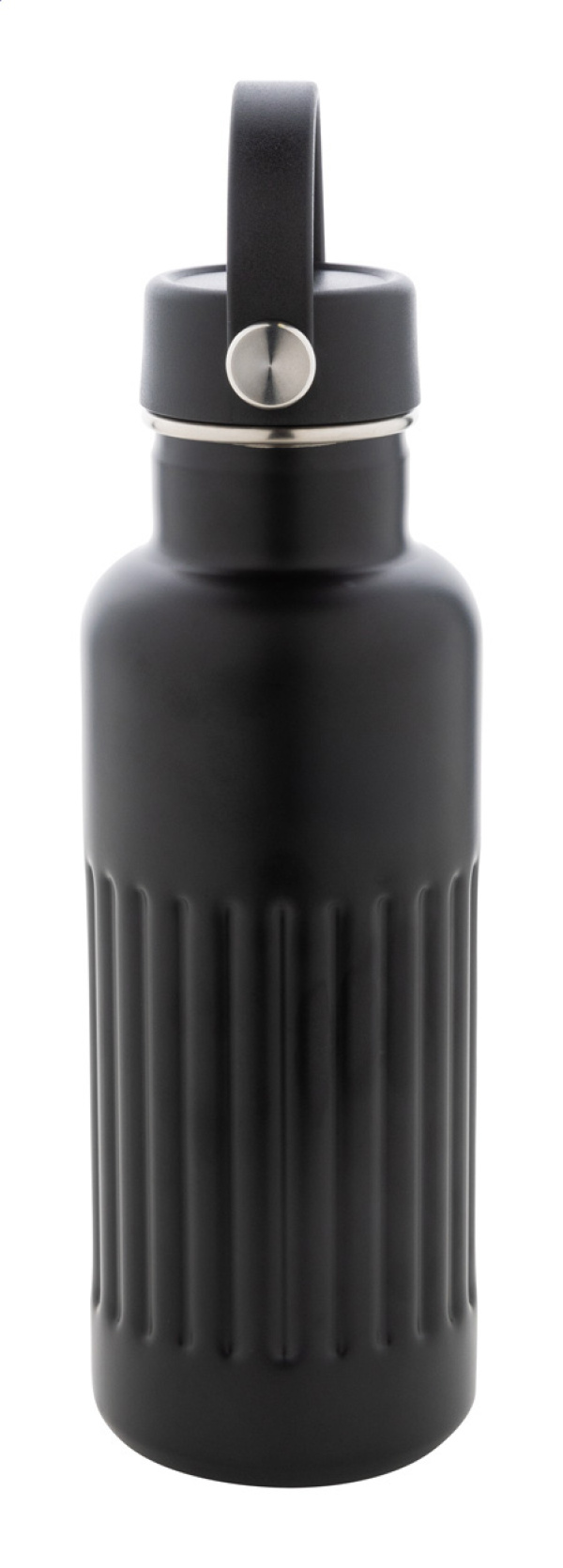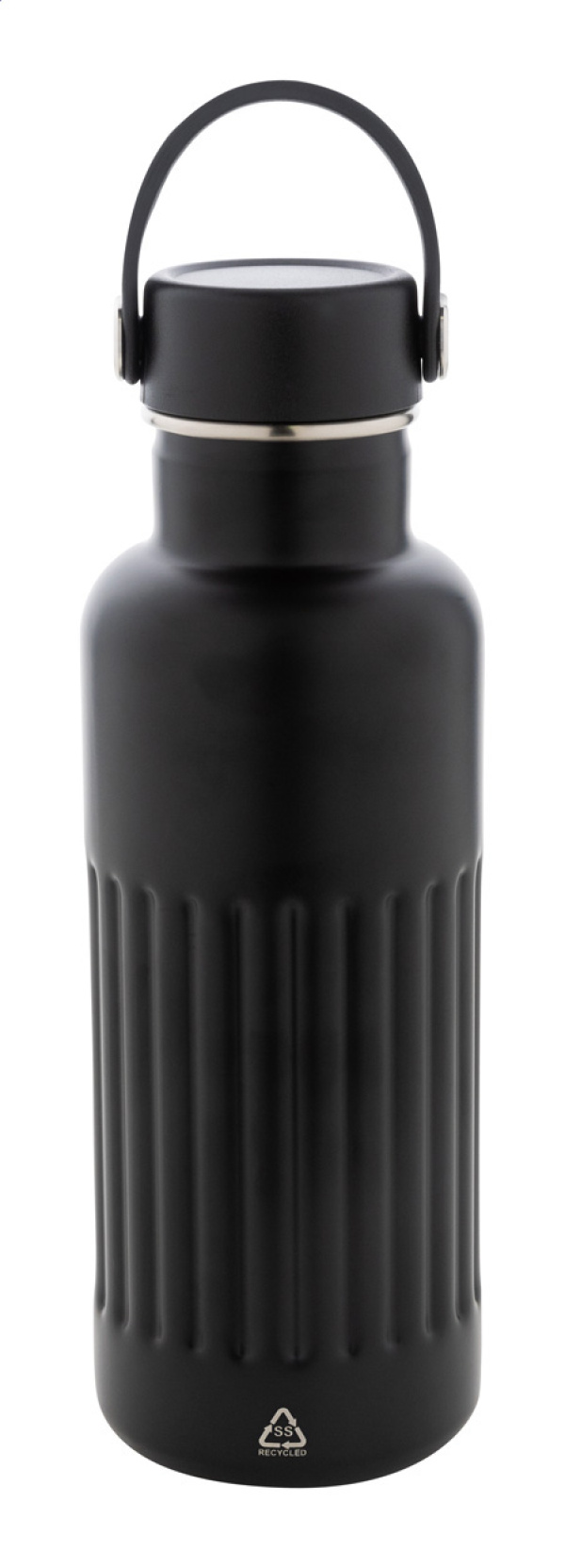Dvojstenná vákuovo izolovaná fľaša z recyklovanej nerezovej ocele s PP plastovým prepravným viečkom. 500 ml.