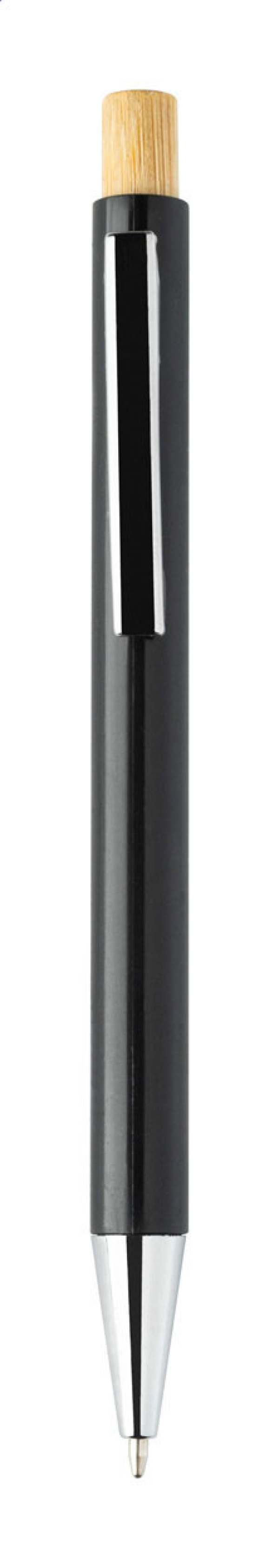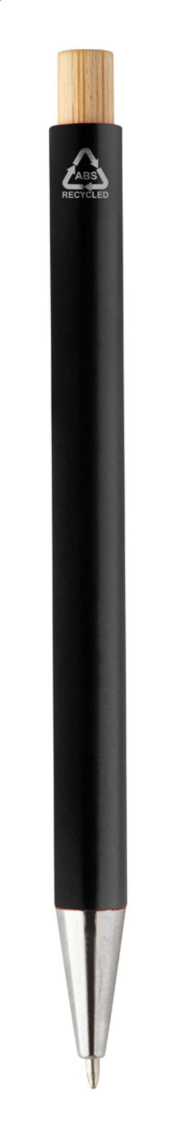 Guľôčkové pero z recyklovaného ABS plastu s bambusovým tlačidlom a kovovým klipom. S modrou náplňou.