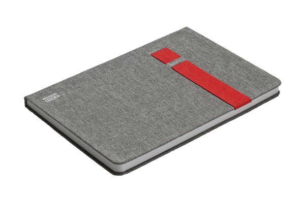 Zápisník A5 v šedých RPET doskách má 80 strán. Blok má pútko na pero a tiež na mobilný telefón.