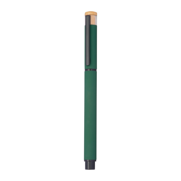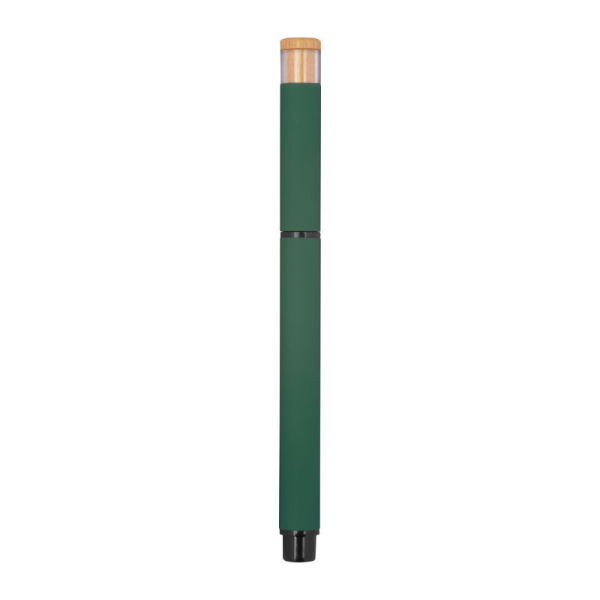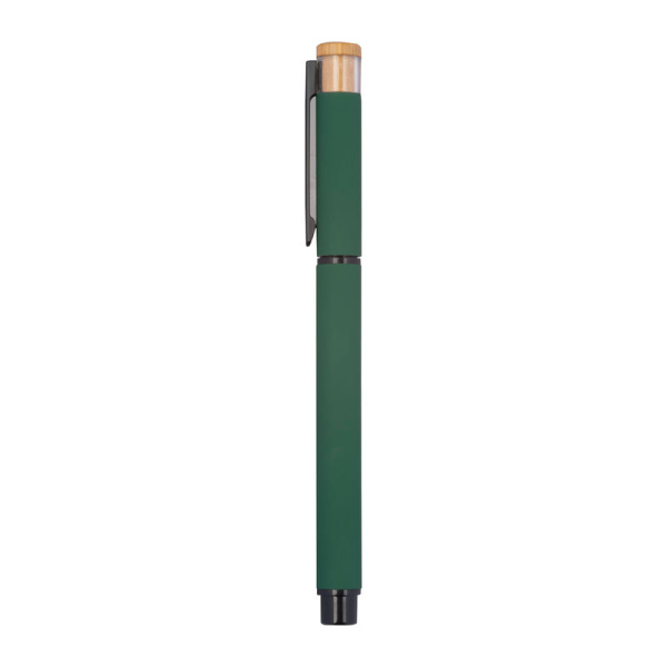 Písací set obsahujúci guľôčkové pero s modrou náplňou Semi-Gel a rollera, z recyklovaného hliníka, s kovovým klipom a bambusovým tlačidlom v ekologickej krabičke.