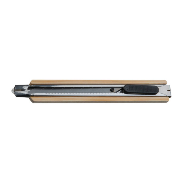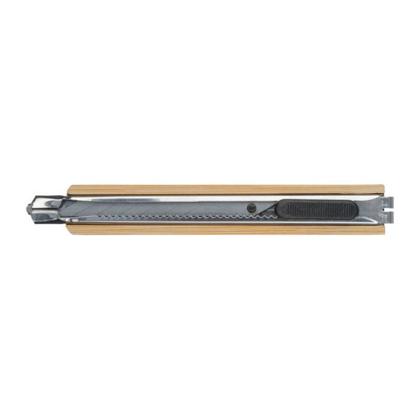 Kovový nôž na listy s bambusovou rukoväťou a bezpečnostnou poistkou.