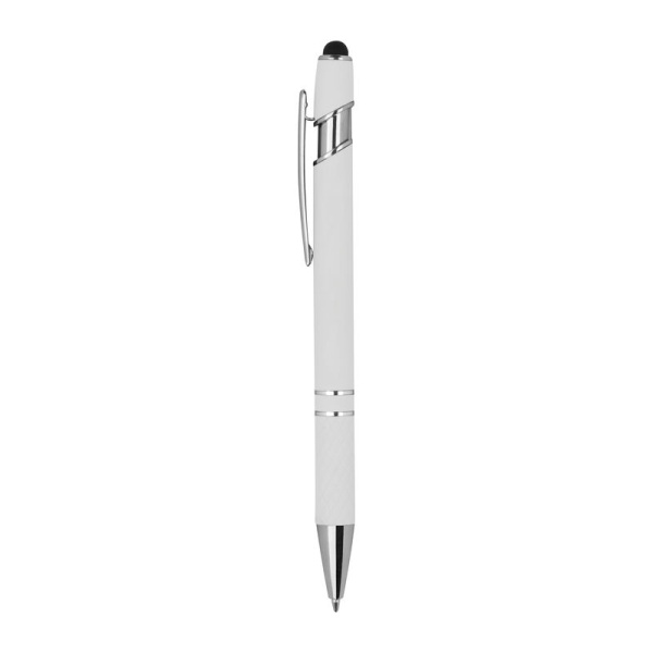 Kovové guľôčkové pero s pogumovaným povrchom, striebornými aplikáciami,  dotykovou funkciou ,vzorovanou úchopovou zónou a modrou náplňou.