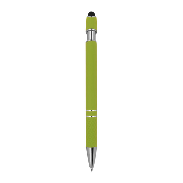 Kovové guľôčkové pero s pogumovaným povrchom, striebornými aplikáciami,  dotykovou funkciou ,vzorovanou úchopovou zónou a modrou náplňou.