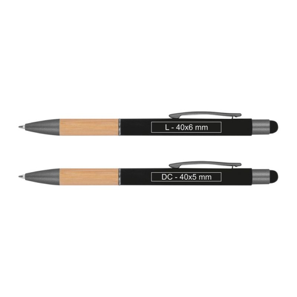 Hliníkové guľôčkové pero s modrou náplňou, dotykovou funkciou, matnými, striebornými aplikáciami a bambusovou rukoväťou.