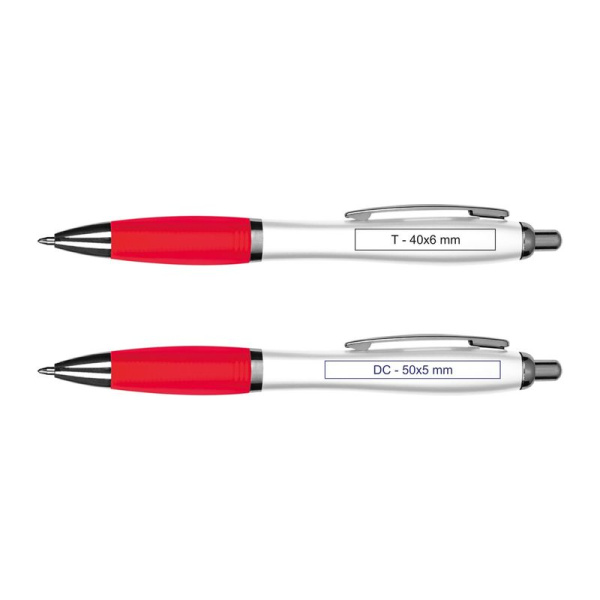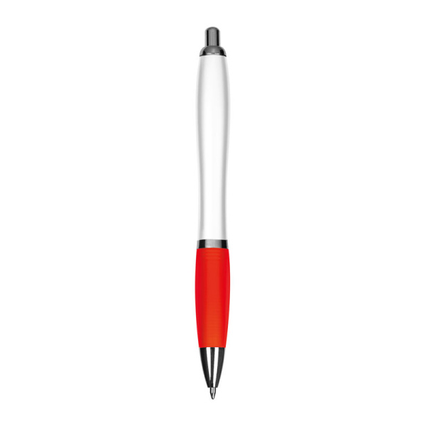Plastové guľôčkové pero s modrou náplňou, kovovou sponou a farebnou gumenou úchopnou zónou. Telo pera je biele, nepriehľadné.