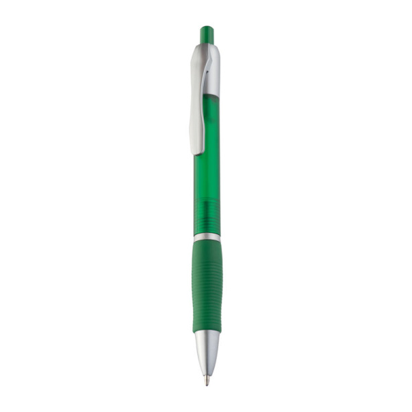 Plastové guľôčkové pero s modrou náplňou a mäkkou vrúbkovanou gumenou úchytkou.