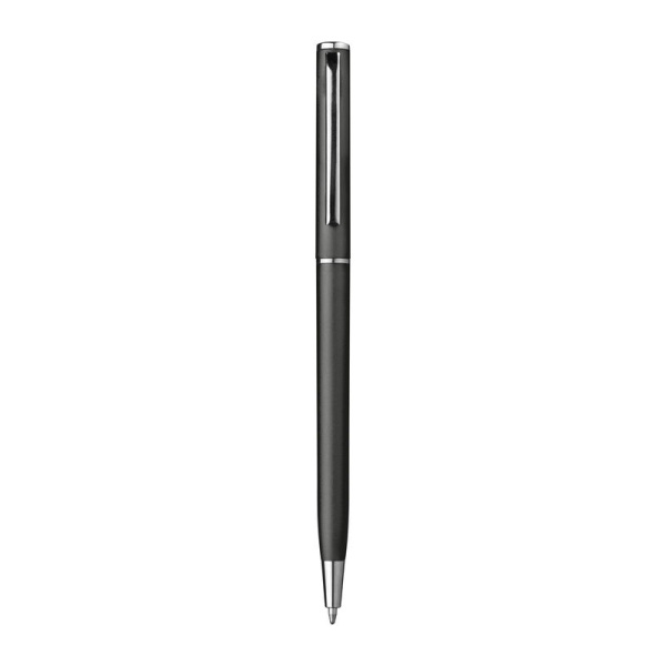 Plastové guľôčkové pero s modrou náplňou. Toto guľôčkové pero sa vďaka svojmu štíhlemu tvaru dokonale hodí do slučiek poznámkových blokov.
