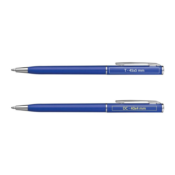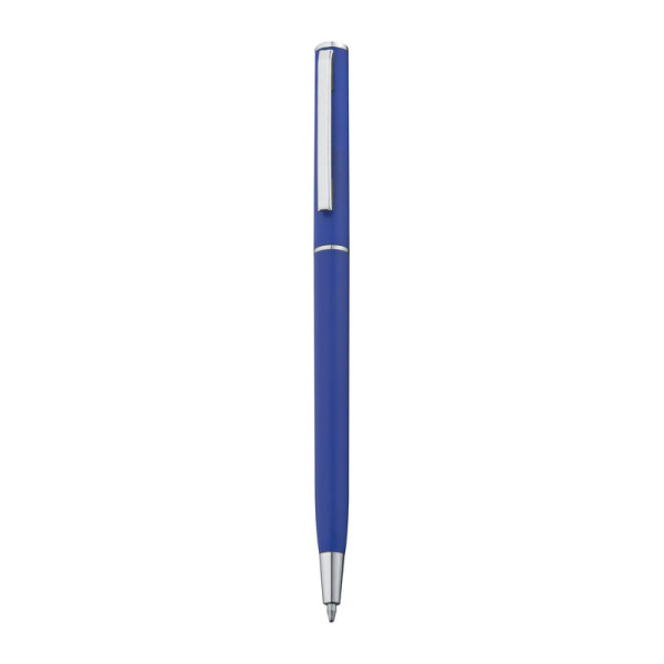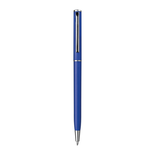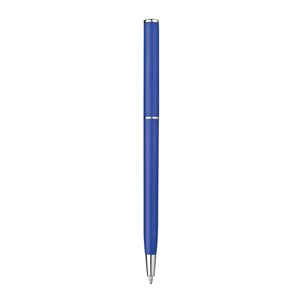 Plastové guľôčkové pero s modrou náplňou. Toto guľôčkové pero sa vďaka svojmu štíhlemu tvaru dokonale hodí do slučiek poznámkových blokov.