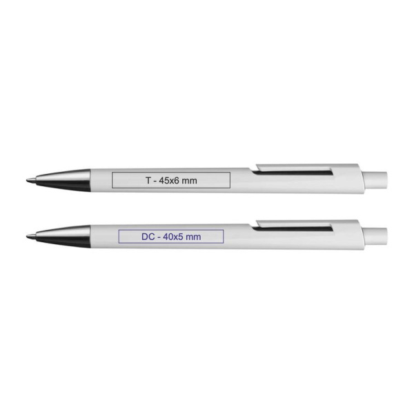 Biele plastové guľôčkové pero s farebnými prvkami a jumbo náplňou ktoré píše namodro.