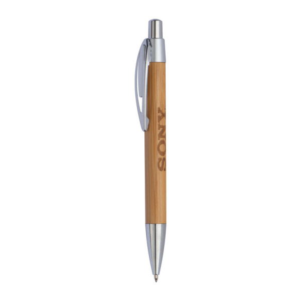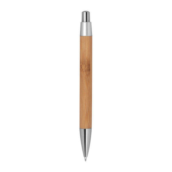 Plastové guľôčkové pero s bambusovým povrchom a so striebornými aplikáciami, modrou tuhou a extravagantným klipom.