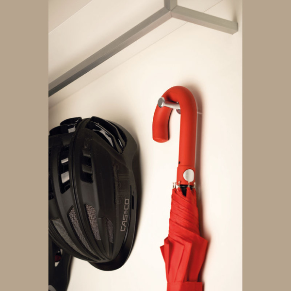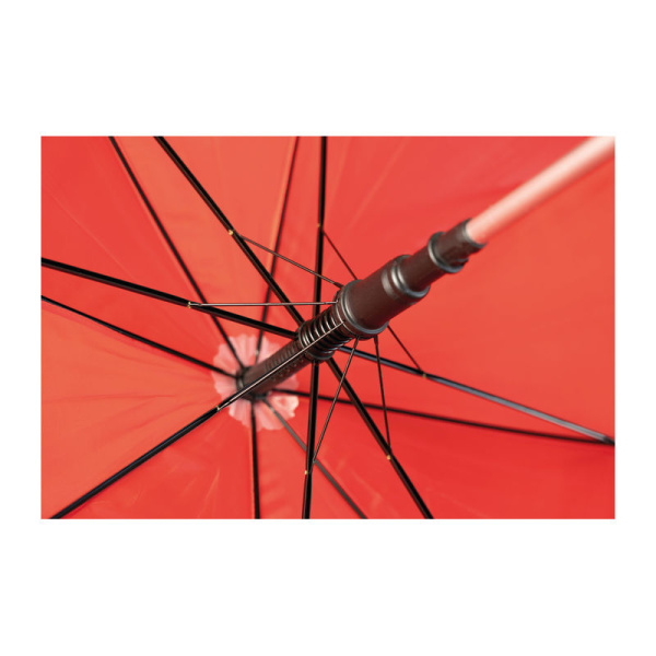 Automatický dáždnik s hliníkovou konštrukciou, kovovým otváracím gombíkom a so zaoblenou gumenou rúčkou.