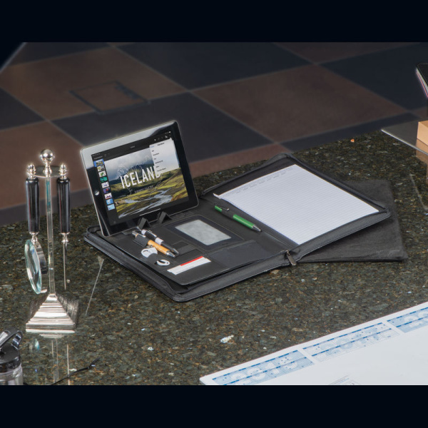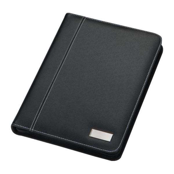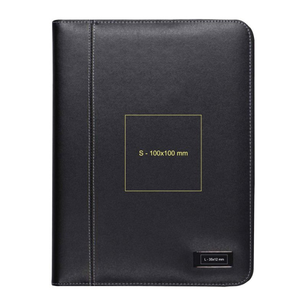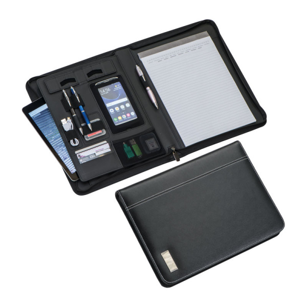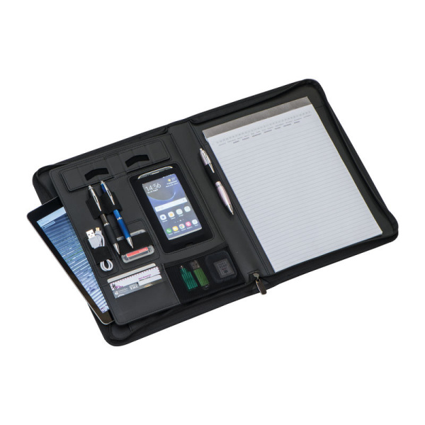 Konferenčná mapa A4 z imitácie kože s uzáverom na zips. Obsahuje držiak na vizitky, pútka na perá, držiak a stojan na smartfón, priehradku na tablet alebo notebook a linajkový poznámkový blok s predtlačeným kalendárom.