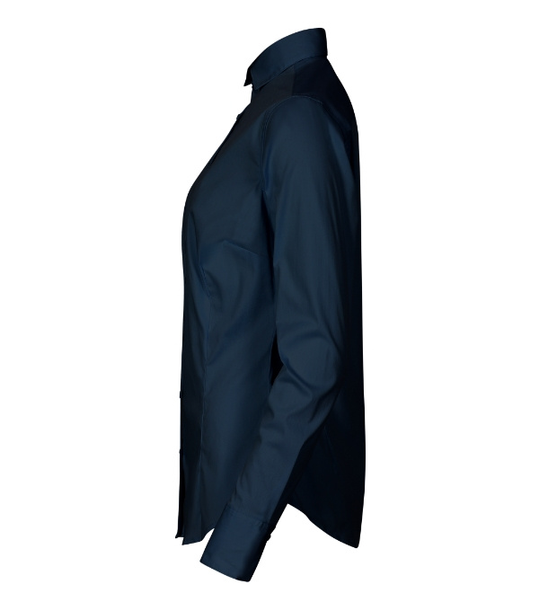 Zúžený strih s bočnými švami, dvojté sedlo na zadnom diele, pásové a prsné záševky, dvojdielny košeľový golier, predné kraje začistené légou, dlhé rukávy so šikmou manžetou na 2 gombíčky, perleťové gombíčky vo farbe materiálu (1 náhradný naviac), tvarovaný dolný okraj. Plátnová väzba, 68 % bavlna, 29 % polyamid, 3 % elastan.