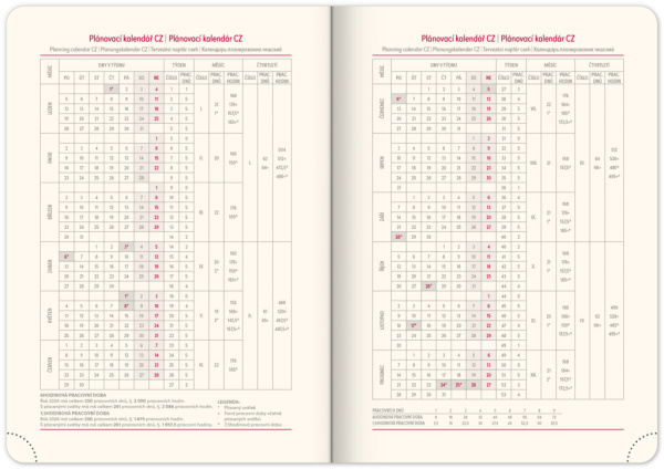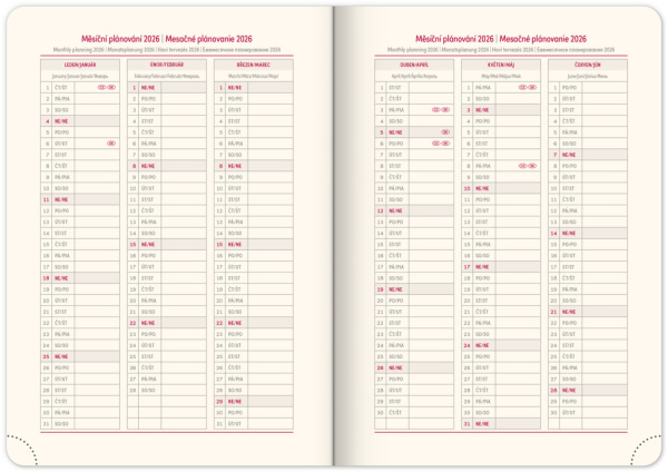 • kalendárium od decembra 2025 • mesačný plánovací kalendár 2026 • mesačný plánovací kalendár 2027 • ročný plánovací kalendár 2026–2027 • pracovný plánovací kalendár • sviatky Českej a Slovenskej republiky a medzinárodné sviatky •Mapa Českej a Slovenskej republiky • miesto pre osobné údaje • textilná záložka • perforované rožky • priestor na poznámky