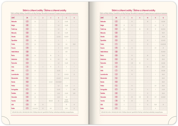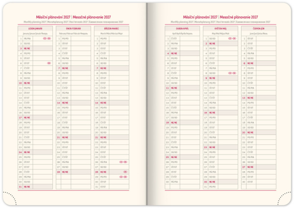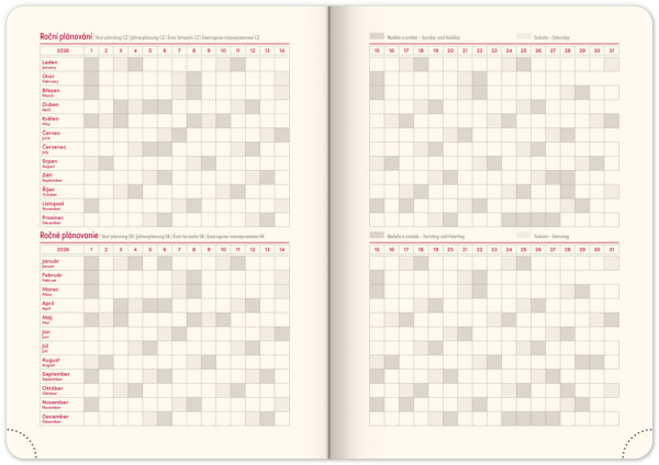 • kalendárium od decembra 2025 • mesačný plánovací kalendár 2026 • mesačný plánovací kalendár 2027 • ročný plánovací kalendár 2026–2027 • pracovný plánovací kalendár • sviatky Českej a Slovenskej republiky a medzinárodní sviatky •Mapa Českej a Slovenskej republiky • miesto pre osobné údaje • textilná záložka • perforované rožky • priestor na poznámky