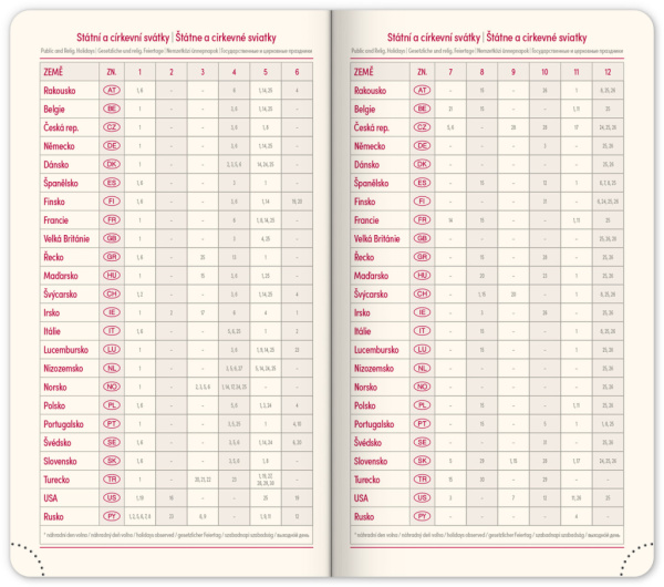 • kalendárium od decembra 2025 • ročný plánovací kalendár 2026–2027 • pracovný plánovací kalendár • sviatky Českej a Slovenskej republiky a medzinárodné sviatky • rozšírený zoznam českých mien • miesto pre osobné údaje • perforované rožky • priestor pre poznámky