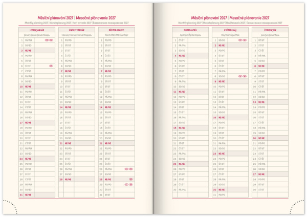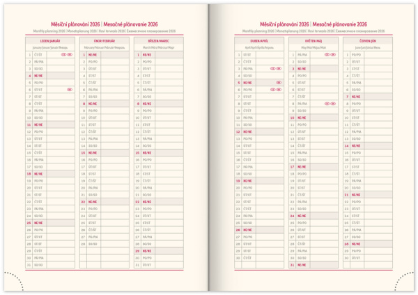 • kalendárium od decembra 2025 • mesačný plánovací kalendár 2026 • mesačný plánovací kalendár2027 • ročný plánovací kalendár 2026–2027 • pracovný plánovací kalendár • sviatky Českej a Slovenskej republiky a medzinárodné sviatky • rozšírený zoznam českých mien • mapa Českej a Slovenskej republiky • miesto pre osobné údaje • textilná záložka