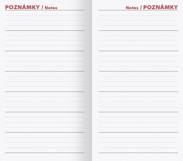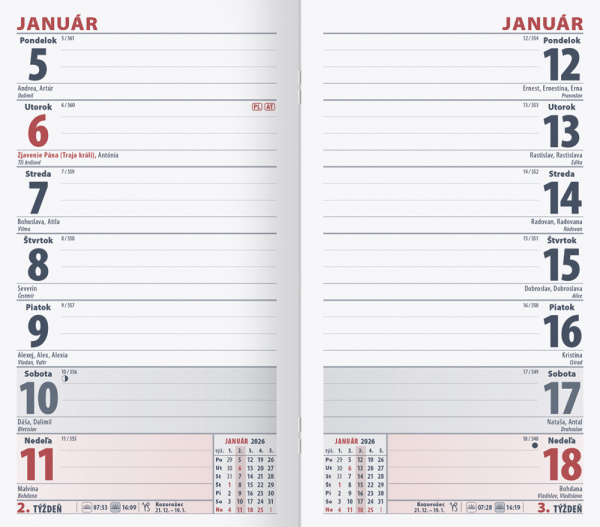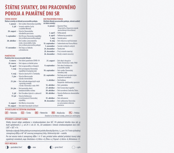 Vreckový, či kabelkový diár s prehľadným týždňom na každej strane. Obsahuje slovenské a české kalendárium, prehľadný aj plánovací