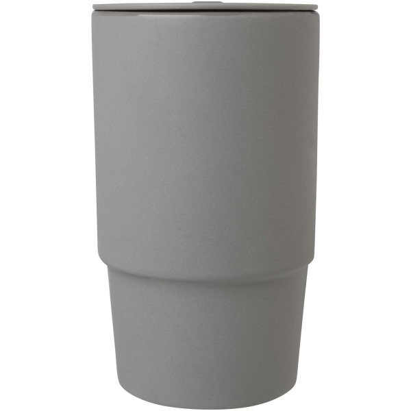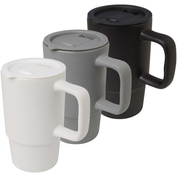 Keramický hrnček s nadmerne veľkým uchom pre jednoduché prenášanie a plastovým viečkom odolným proti rozliatiu pre pohodlné nosenie na cestách. Vonkajší povrch má štýlový matný povrch a fľaša je pri všetkých metódach tlače vhodná do umývačky riadu. Dodáva sa v darčekovej krabičke z recyklovanej lepenky. Objemová kapacita: 450 ml.