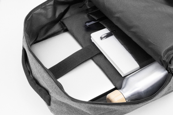 RPET batoh s hlavnou priehradkou na zips a 3 prednými vreckami na zips. S polstrovanými priehradkami na tablet (10") a notebook (15"), polstrovaným chrbtom a ramennými popruhmi. 600D RPET polyester s výrazným štítkom RPET.