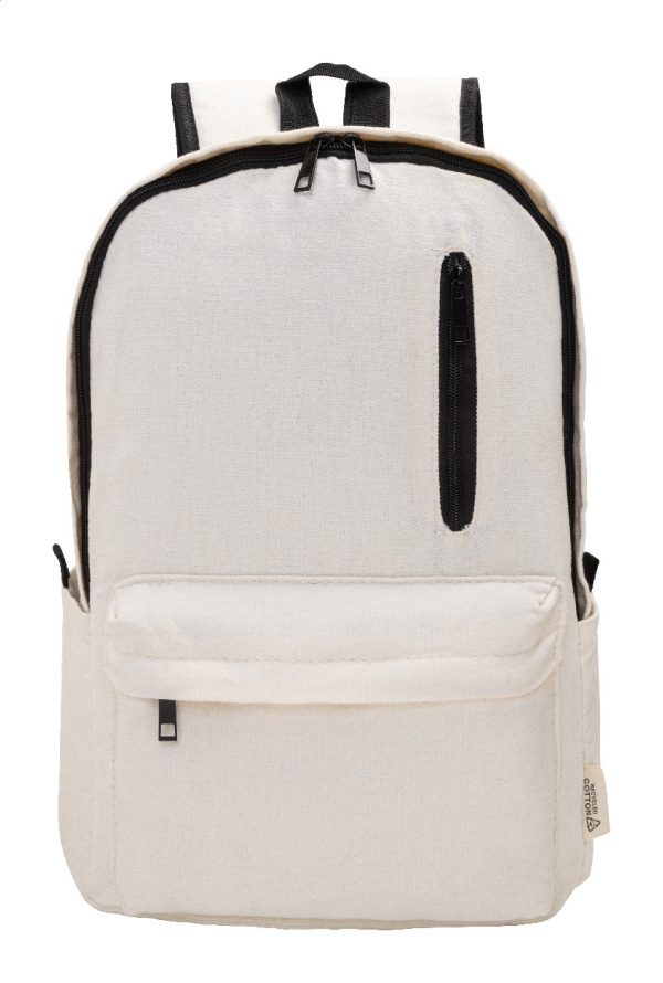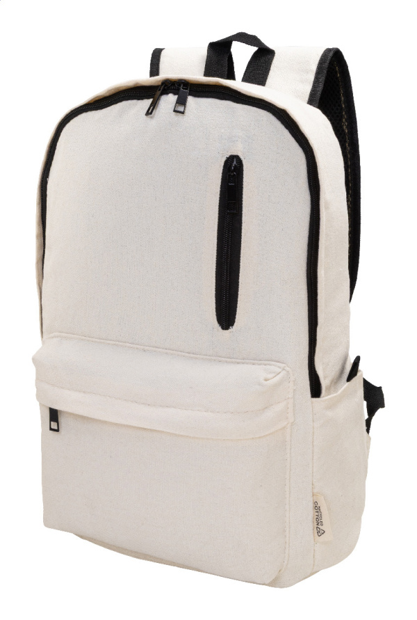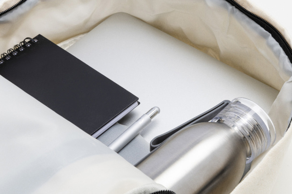 Recyklovaný plátený batoh s hlavnou priehradkou na zips, polstrovanou priehradkou na notebook (15"), 2 prednými vreckami na zips, bočnými vreckami, popruhom na kolieskach, polstrovaným chrbtom a ramennými popruhmi. 70% recyklovanej bavlny a 30% RPET polyesteru.