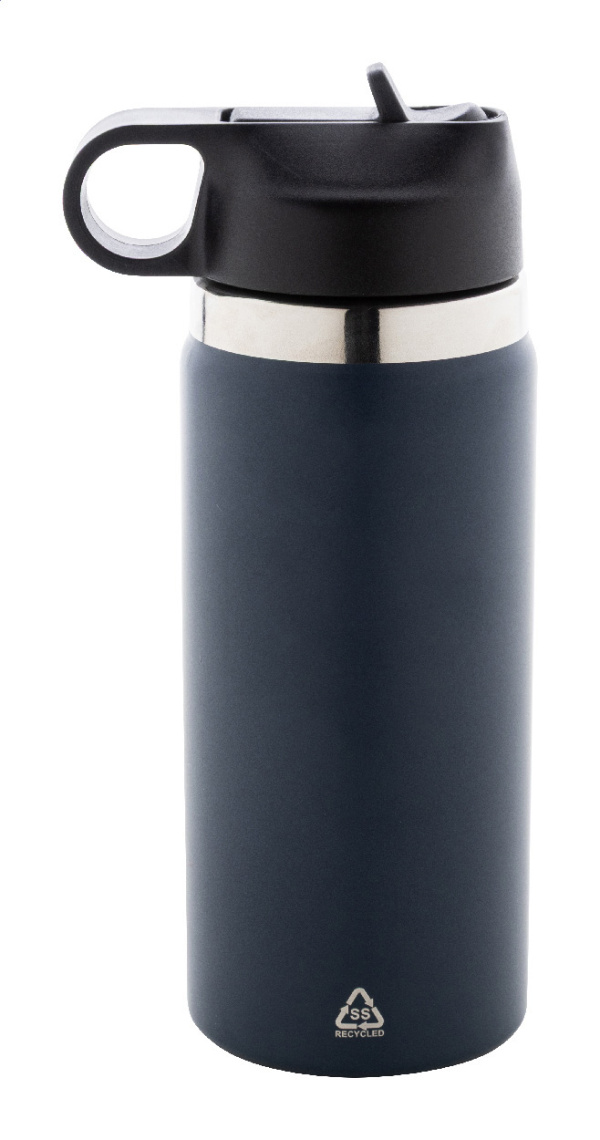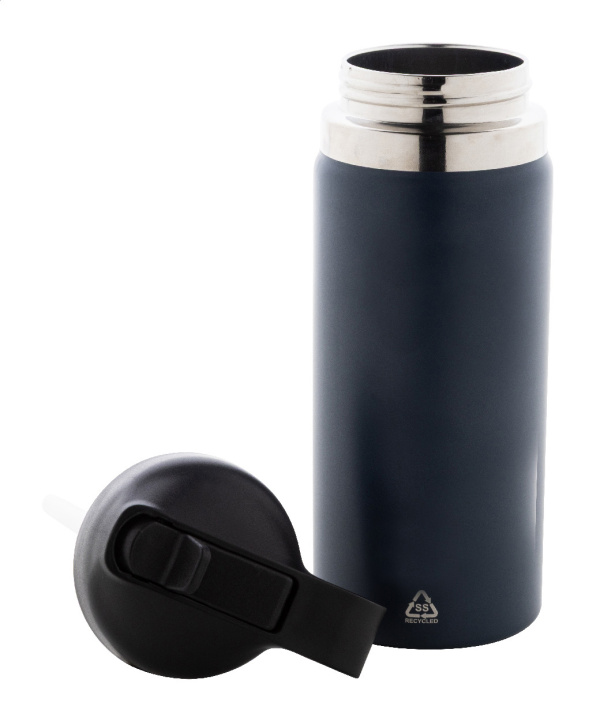 Dvojstenná vákuová fľaša z recyklovanej nerezovej ocele s odklápacím viečkom z PP, rukoväťou a integrovanou slamkou. 500 ml.