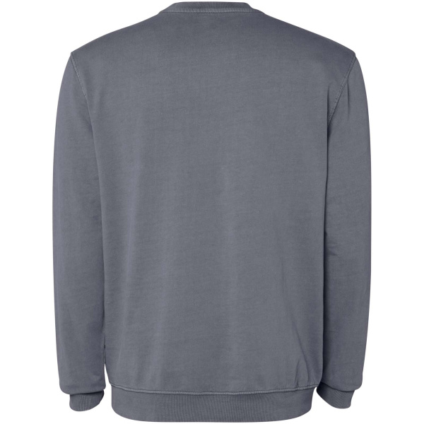 Unisex sveter s ošúchaným vzhľadom. Golier s rebrovaním 2 × 1, manžety a lem v tóne látky. Spevnené švy na manžetách, leme, páse a pod pazuchami. Krycí steh v tóne látky pri krku.