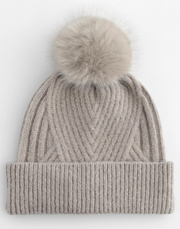 ·50 % recyklovaný polyester, 13 % akryl, 34 % nylon, 3 % elastan ·Luxusný ťažký rebrovaný úplet ·Mäkká látka ·Retro štýl ·Luxusný brmbolček z umelej kožušiny ·Lemovaný dizajn pre optimálne zdobenie ·Odtrhnuteľný štítok pre jednoduchú zmenu značky.