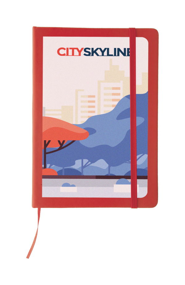 Poznámkový blok so 100 listami, záložkou a gumičkou.