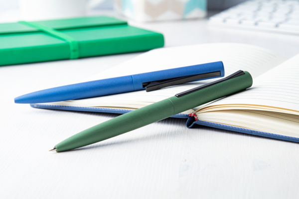 Guľôčkové hliníkové pero v matnej metalickej farbe so špeciálnym otočným mechanizmom, s modrou náplňou.