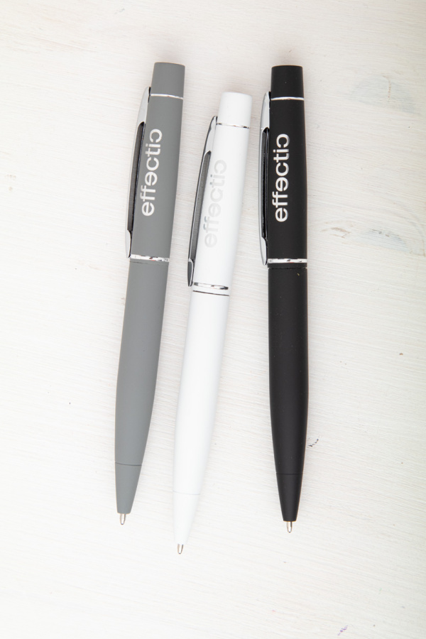 Kovové otočné guľôčkové pero s pogumovaným povrchom a modrou náplňou. Špeciálny povrch na gravírovanie strieborného loga.