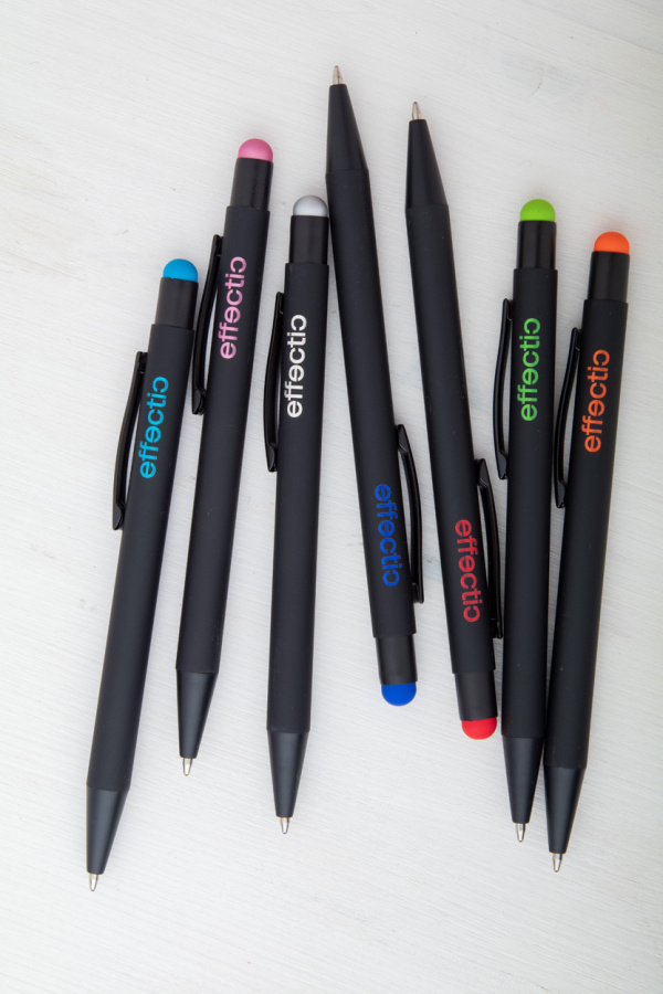 Hliníkové guľôčkové dotykové pero s pogumovanou úpravou a špeciálnym povrchom na zrkadlové gravírovanie vo farbe dotykového konca, s modrou náplňou.