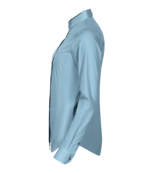 Zúžený strih s bočními švami, pásové a prsné záševky, dvojdielny košeľový golier, predné kraje začistené légou, dlhé rukávy so šikmou manžetou na 2 gombíčky, gombíčky vo farbe materiálu (2 náhradné naviac), tvarovaný dolný okraj. Popelín, 100 % bavlna.